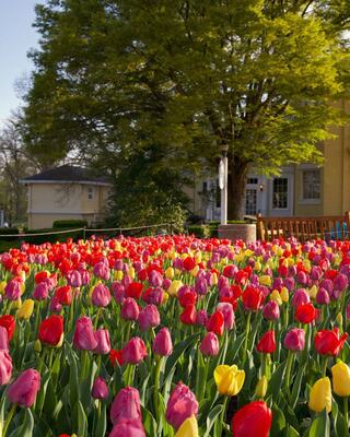 Seasonal floral displays include tulips, hyacinths, and daffodils in spring, followed by summer blooms like canna, salvia, petunias, and geraniums. Fall brings rich hues of mums, complementing the changing foliage.