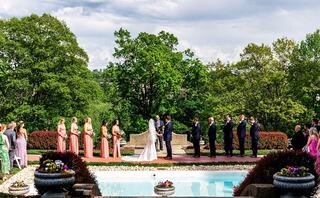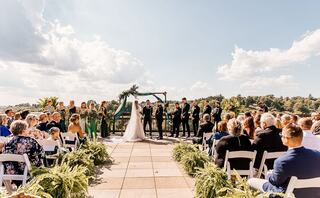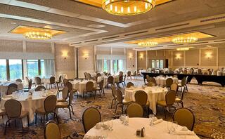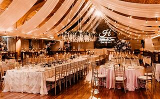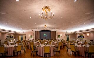This large room's unique split level layout offers wedding guests plenty of elbow room and features, plus an elevated stage complete with power screens, sound system, remote lighting, and dance floor.